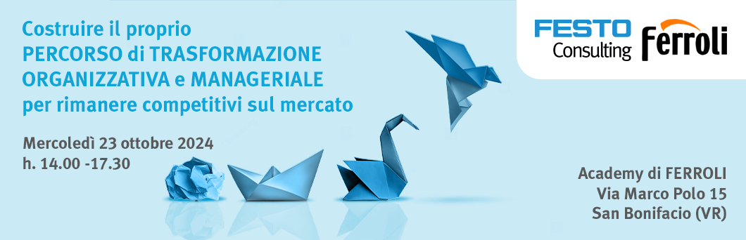 Ripercorrendo i concetti del libro “Trasformazione Aziendale”, scritto dai professionisti di Festo Consulting, il Workshop propone un possibile approccio per rinnovare le aziende di cultura imprenditoriale. Ci confronteremo con professionisti del cambiamento all’interno di una Tavola Rotonda conclusiva.